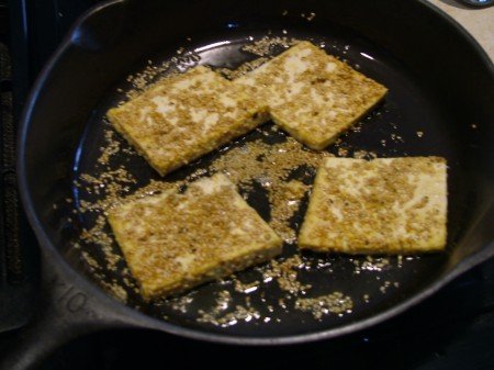 Mix sesame seeds, nutritional yeast and pepper together. Dredge moist tofu slices in the mixture, totally covering each side. Sauté in olive oil in preheated (medium high) cast iron frying pan for 2 minutes per side or until golden brown. Mix tamari and water together and pour over the tofu. Simmer for 2-3 minutes until the tofu is infused with the flavored liquid.