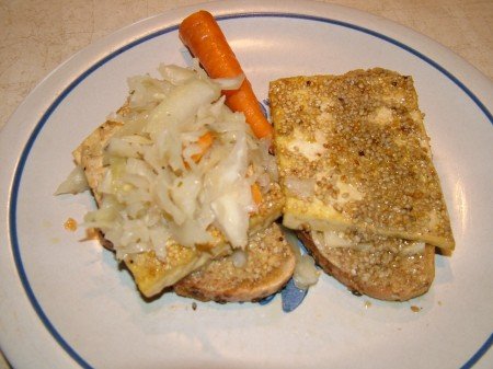 Place tofu slices on toasted bread prepared with mustard and cheese. Be sure to spoon on the excess juice and sesame seeds left in the pan. Top with sauerkraut and enjoy!