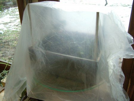 To construct my simple green house, I used some plant markers and lengths of PVC tubing to create a frame over which I just laid a folded large piece of thin poly.