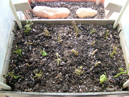 I haven’t checked the temperature under the plastic but it’s noticeably warmer than room temperature. Our sun room gets pretty chilly at night and sweet potatoes like it hot. The sprouts are leafing out nicely. The task now will be keeping the plants alive and healthy until they are ready to plant. I only need 18 plants and I already have 21 cuttings, so my chances are good. And I’m sure I can find some gardeners eager to take any extra slips I end up with.
