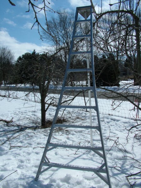 The ladder in the picture is made by a company called Tallman Ladders out of Hood River, Oregon. My internet searching had already convinced me Tallman was among the best ladders available, and when they responded to my quote request by telling me they had a dealer in Fort Atkinson, Wisconsin, I was pretty sure it was going to be a Tallman Ladder for me. I contacted the local dealer, whose family business is a cherry orchard, the ladders are a sideline. He quoted me a price that was almost $150 less than if I had a single ladder shipped from the west coast. The next day, I drove to the dealer, 16 miles away, and returned home with my new 10′ tripod ladder.