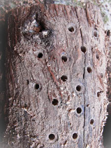 The logs before drilling. I peeled off some of the bark so that I could get the holes deeper into the wood. Note that beetles have already made some pathways.