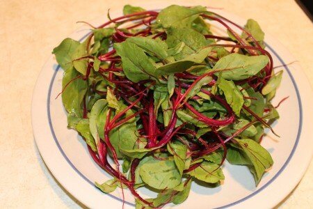 I planted beets the last week of August for a late fall harvest.  I had used old seed so I planted them thickly, but they still germinated heavily.  So we’re now thinning them and using the baby beets in salads, as a vegetable side, and in drinks.  The greens are looking great.  Here’s a plate of them.  We use roots and all, just wash the whole plant.