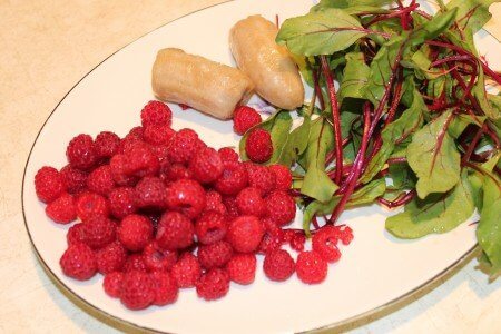 Judy took half the beet greens, and added half a frozen banana and some raspberries we picked last night. We didn’t grow the banana.