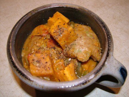 Sauté onions and red peppers in olive oil for a couple of minutes over medium heat. Add sweet potatoes and continue to cook for about 5 minutes.