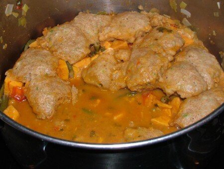 Drop heaping tablespoons of the dumpling mixture onto the top of the bubbling stew. Cover and simmer until dumplings are cooked through, about 10 minutes. Test a dumpling and cook a little longer if necessary. Enjoy!