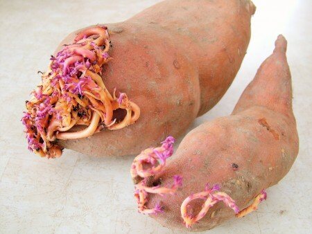 For the last two years I’ve grown my sweet potatoes using sprouts like this, rather than starting new sprouts on a whole potato. This method is much easier. Vine cuttings would work nearly as well.