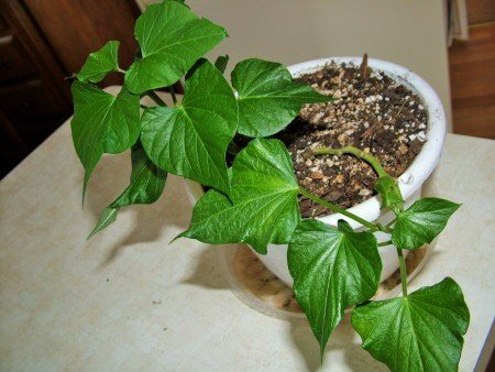 Here’s a live sweet potato plant that I started last fall. It’s my back-up. I can take small sections of vine and root them, if I need to.