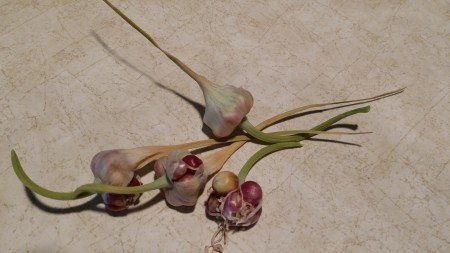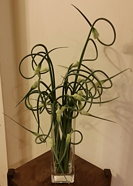 Lastly, I put a few in a flower vase which made a beautiful bouquet. They lasted over four weeks as a bouquet, but now the stems have faded and the flowers have gone to seed. What I found very interesting is that the seed heads have continued to grow while in the vase into bigger ‘little’ garlic cloves. They can be tossed in a pot of soup or planted, though with the tiny cloves it’s a two-year process to get full sized bulbs – your choice!