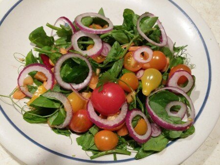 I made this pea shoot salad last night which included all garden pickings – pea shoots plus baby carrots, baby beets, cilantro, red onion and several varieties of cherry tomatoes. The first time I knowingly ate pea shoots was this past summer. We were on a road trip to the GWA (Garden Writers Association) conference and stopped for lunch in South Bend, IN. We found a great little Chinese restaurant (J.W. Chens) just off the freeway right next to Notre Dame University. We had a most delicious lunch that included a side of lightly sautéed pea shoots. I’m guessing the light seasoning may have been sesame oil and garlic.