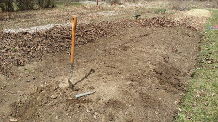 I try to cover my beds with leaves in the fall. The leaves protect the beds during the hard freeze, slow down weed production, and make it easier to get into the garden early in the spring. This picture shows the leaves raked off and any weeds that did sneak through pulled out. I use the leftover leaves as mulch in the paths or I just sweep them into an adjacent bed as I open up the garden. I don’t work the leaves directly into the bed soil. That’s too much work and I think would probably make the soil too acidic as opposed to just letting the leaves break down in the paths.