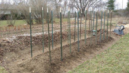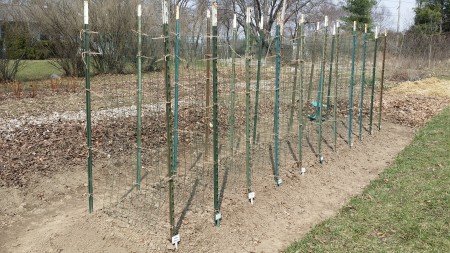 I’ve added about 20 gallons of compost to my 20 foot long bed. I’ve scraped up some soil from the adjacent paths and raked and smoothed up the bed to give it some height. The trellis system uses T-posts spaced 3 feet apart and 21” between the rows. The trellis lattice is two foot wide fencing cut to 60″ lengths, laced crosswise between the posts with jute. The T-posts are 90” long with about 70” above ground.