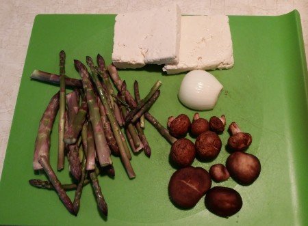 A couple of days ago Noel brought in shiitake mushrooms from our logs at the side of the woods. I had a handful of fresh picked asparagus, some tofu leftover from a stir fry and a few cremini mushrooms in the fridge. Here’s what I came up with for a very satisfying breakfast.
