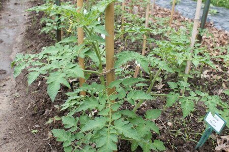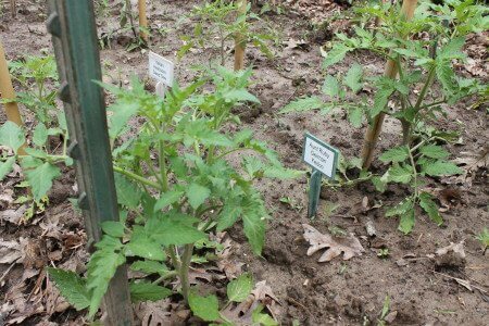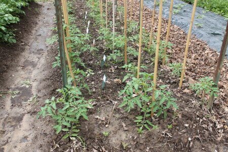 As the tomatoes grow, I’ll start lacing the main stem to the stakes. I’m going to be more aggressive in pruning than in previous years and probably trim down to two leaders (main branches) per plant in most cases.