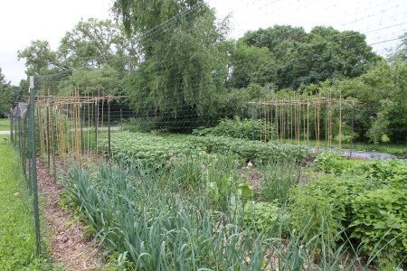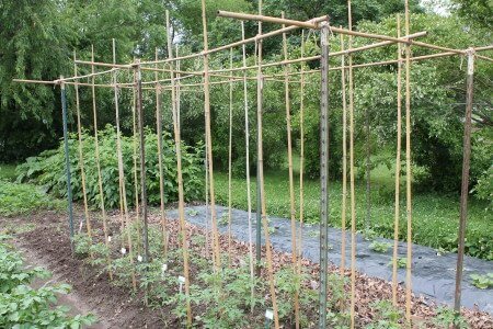 This year I’ve simplified the design. I eliminated the traditional tomato cages. In a well-trellised system, the cages are only in the way. They are hard to weed around and fruit gets wedged in the wires. I’m also using the t-posts that hold up the structure as trellising stakes for the plants adjacent to the posts, so I’m using less bamboo than last year.
