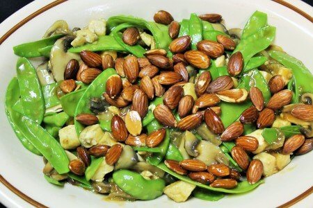 Add the onions back to the pan along with mushrooms, pea pods and veggie broth. Cover and cook for 2 minutes. Mix tamari, arrowroot and maple syrup in a small cup until thoroughly combined. Stir into veggies for about a minute to thicken the juice. Sprinkle the almonds on top and serve over rice. We had black forbidden rice which has a nice nutty flavor and texture to complement the vegetables.