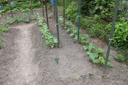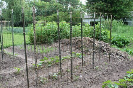 Several of the online setups I looked at used wood posts for framing set up as a sloped A-frame. I think the T-posts, being vertical will allow for easier weeding and harvesting with enough space to get to both sides of the grid easily. The T-posts are also easier to work with than wood.