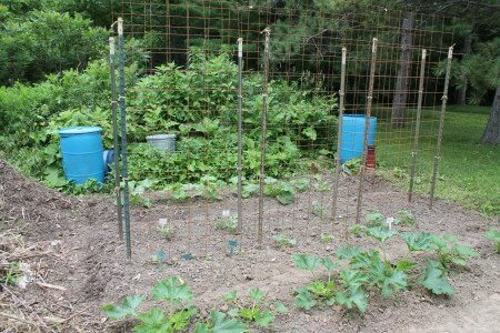 The trellises were very easy to set up. After laying out my tentative spacing, I just pounded in the first T-post and laced in the grid using jute twine. I used some spring clamps to hold the grid in place while I laced the grid to the post. Using the untied edge of the grid as a guide, I pounded in the next T-post, clamped the first and second grid to the new post and laced them in together. From this point, it’s just a matter moving down the line with as many grids as you want to use. It’s a very simple process.