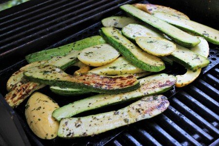 Coat the squash pieces with the marinade and cook on grill preheated to high. Turn down to medium high if it seems too hot. Turn every 5 minutes, basting if necessary with extra marinade, until done. Obviously, thicker pieces will take a little longer. Yummy!