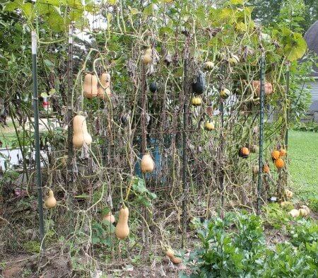 The advantage of trellising is space saving. These squash only took up about 60 square feet of garden space, grown in one 10 foot raised bed.