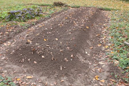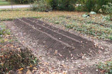 After I ridged up the bed, I planted the garlic. It likes to grow up high on the top of the ridge and I can use the rest of the bed, the slopes and the trough bottoms, to plant lettuces and other greens in the spring.