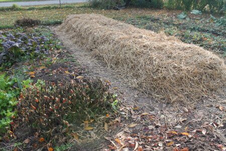 The garlic was planted along the ridges, six inches apart. I put the softneck seed in the middle row. After the cloves were planted I covered the bed using two small straw bales, fluffed up to be as loose as possible.