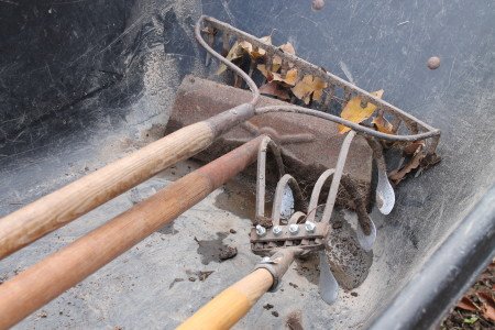 I used these tools to make three tall ridges in the bed. I softened the soil with my old five-tined cultivating hoe. I made deep troughs and tamped the soil with an old square hoe, which I’m guessing was originally sold as a cement hoe. And I used a steel rake to make everything smooth.