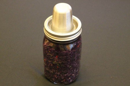 While that’s a perfectly fine method I was introduced to Kraut Source by an e-mail note from my daughter – she knows where my interests lay! They ‘kraut sourced’ their new ‘gizmo’ and I was intrigued. It has a spring-action top to keep the veggies submerged below the liquid and a moat ‘water filled’ top with a loose cone-shaped cover so the ferment burps itself. The only thing you need to do while the fermentation is doing its thing is to keep the moat filled with water which keeps the air out.