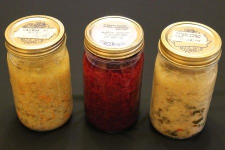 Here’s a picture of the three quarts I made a couple of weeks ago – fermented for ten days. From left to right: Dilly Kraut with Carrots, Purple Kraut with Apples, Raisins & Cinnamon and Kraut with Onion, Cilantro, Ginger, Cumin Seeds & Hot Pepper