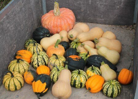 Our trellised smaller winter squash and our larger trailing vine squash were both super productive. We are trying to figure out what to do with it all.