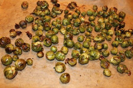 Lately I’ve been roasting the sprouts. There are lots of variations on the theme but basically the vegetables are tossed with olive oil, salt and pepper and roasted in a 400 degree oven until “done”. I use “done” loosely because your version of done may be different than mine. Timing can be anywhere from 20 minutes to 45 minutes, depending upon the size of the sprouts and your definition of done. Some people like them just barely cooked and some like them browned and crispy. Use some caution, overcooking can make them mushy inside.